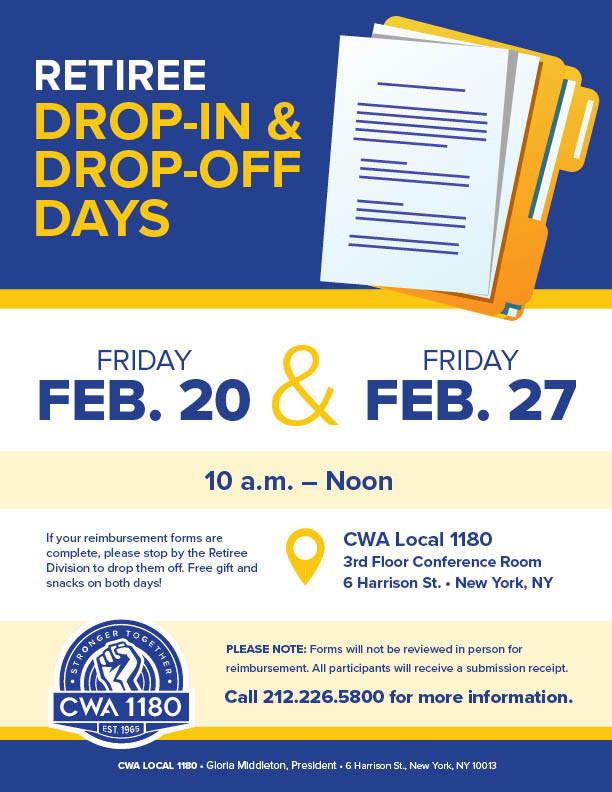 | Tues. 2/17 | IN-PERSON Review of Online Lessons / Q&A | 6 Harrison St. Call the Retiree Division to reserve your spot today: 212.226.5800 |